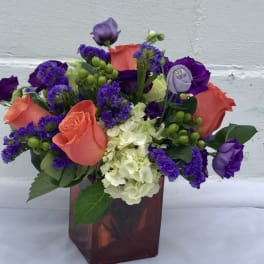 Price: $75.00 Cube compact bright arrangement with purple green and orange Product Tags: Next-day Delivery