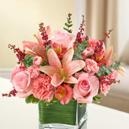 Price: $75.00 Cube compact bright arrangement with purple green and orange Product Tags: Next-day Delivery